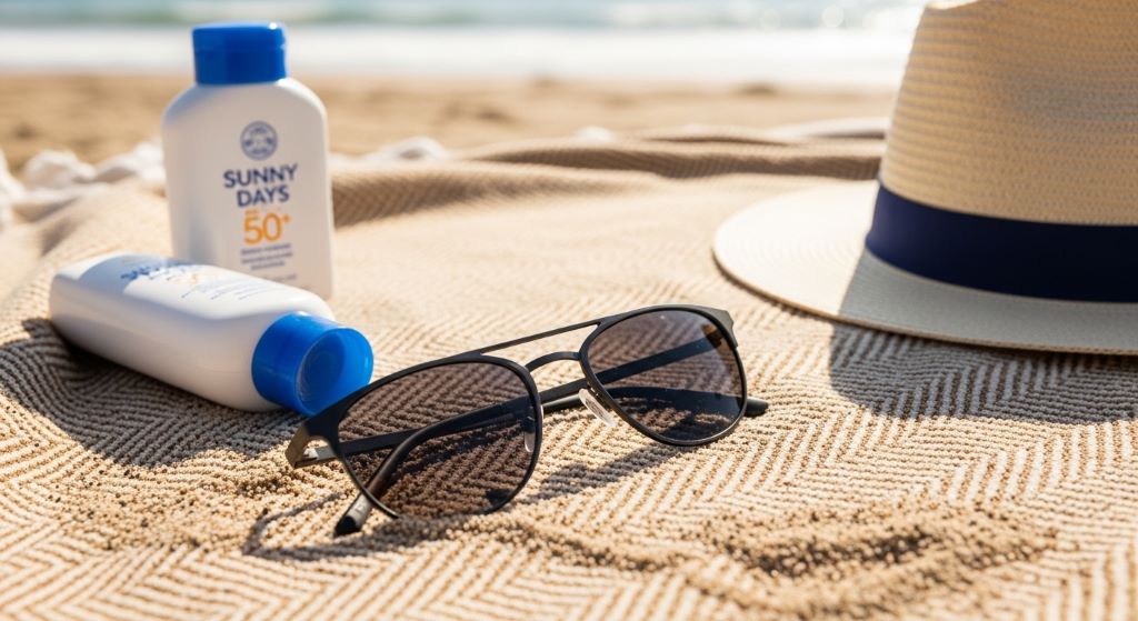 Close-up of premium eyewear resting on a sandy beach towel with sunscreen and a straw hat beside them